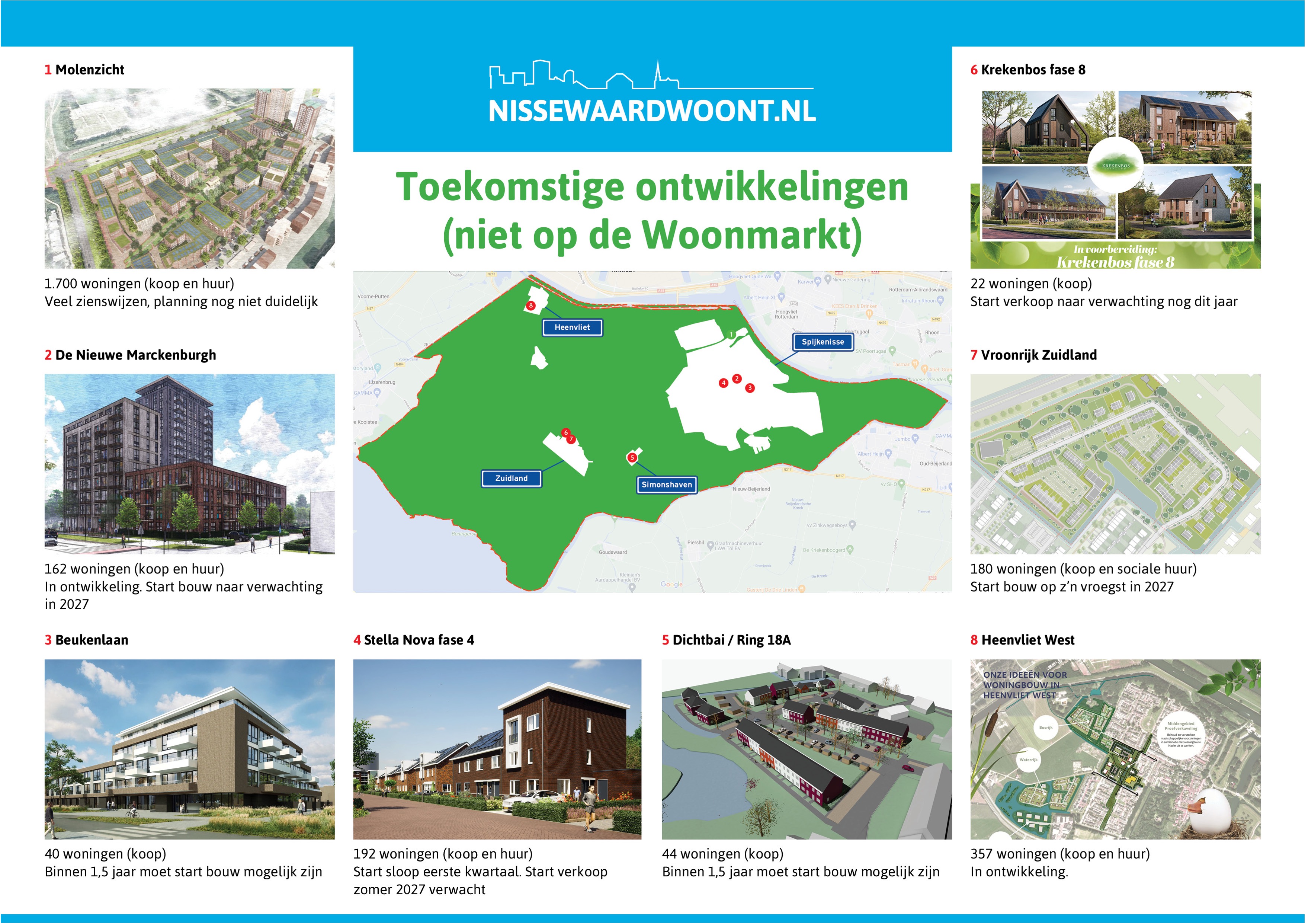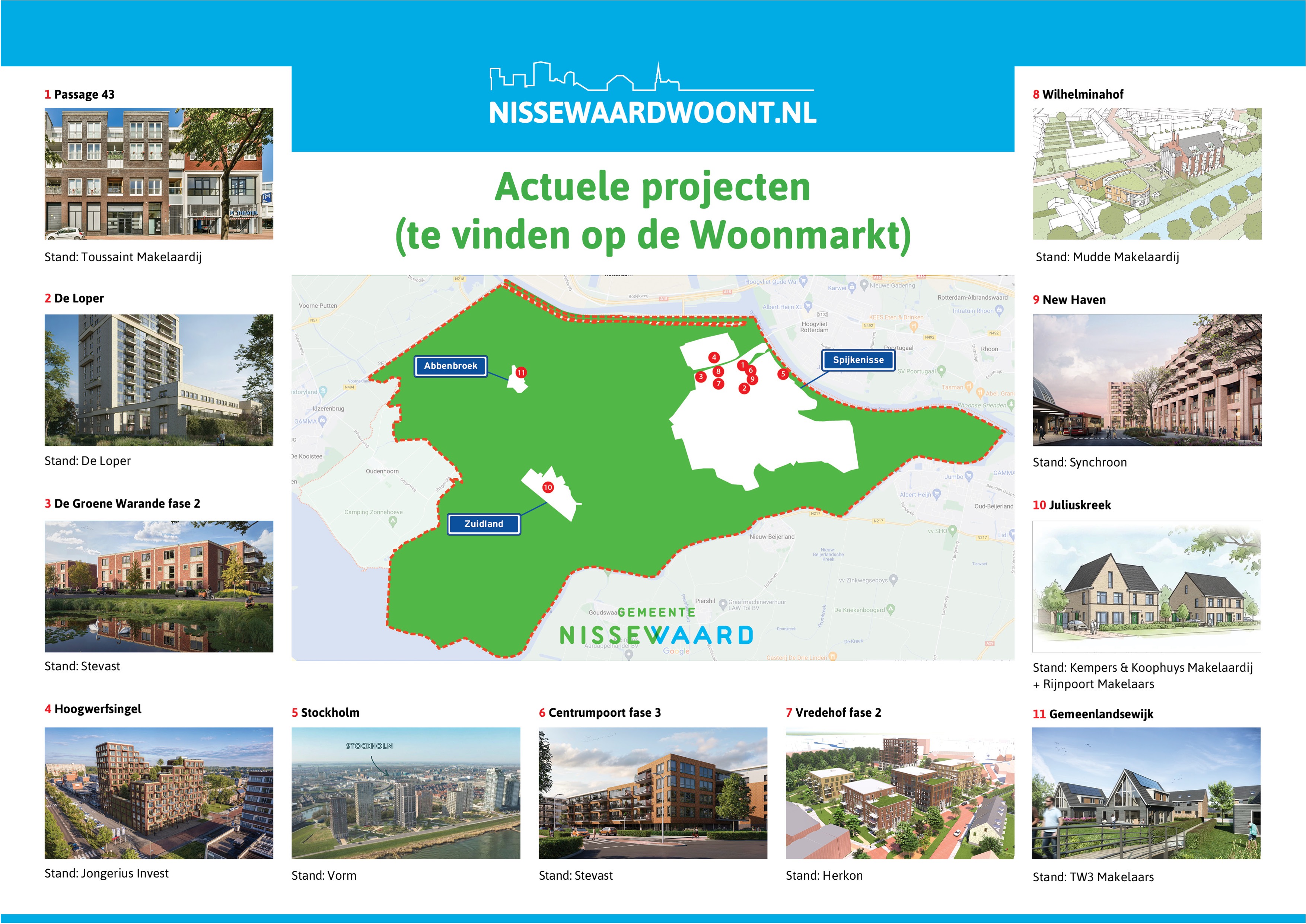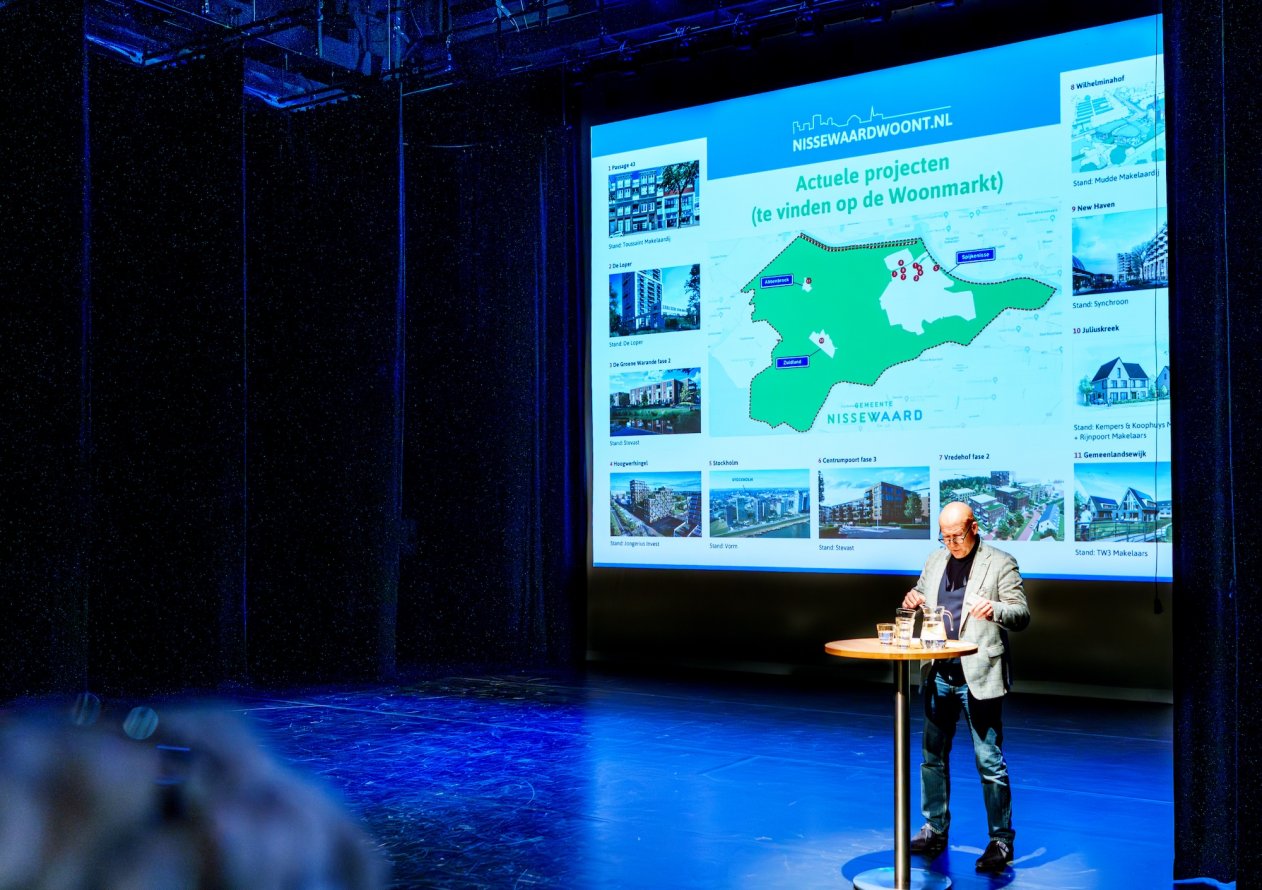 De Woonmarkt Nissewaard vindt meestal één keer per jaar plaats. Wethouder Jan Willem Mijnans (Wonen), die in een volle kleine zaal een overzicht gaf van actuele én toekomstige nieuwbouwontwikkelingen (zie de kaarten hieronder), blikt zeer tevreden terug op het evenement. "Met ruim 800 bezoekers is het duidelijk dat de Woonmarkt voorziet in een behoefte van onze inwoners en van de bewoners in de regio", aldus Mijnans. "Het is mooi dat we zo'n evenement, samen met zo veel marktpartijen, kunnen organiseren."
